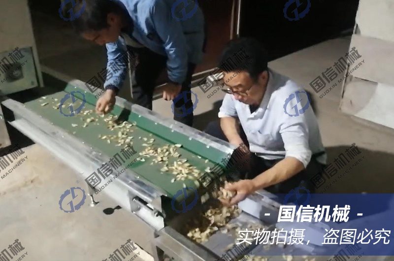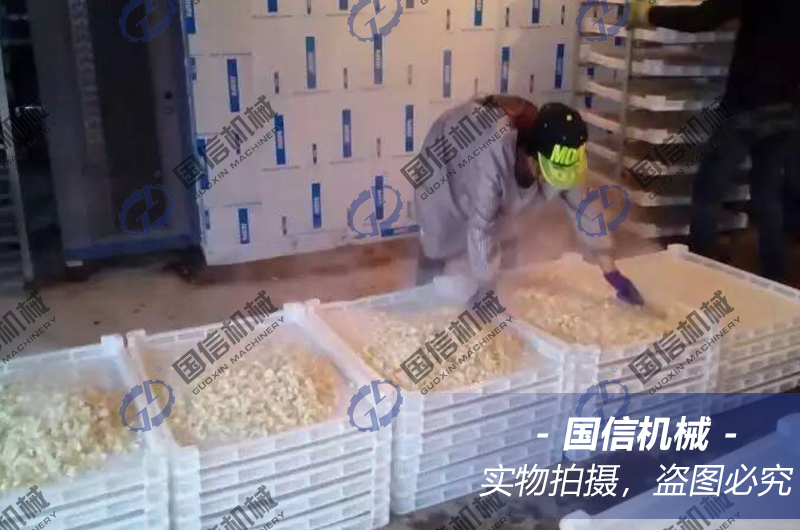 熱風(fēng)干燥:把瀝干表面水分的鱗片放入料斗內(nèi),經(jīng)自動鋪料裝置送入百合烘干機*上層進行干燥,溫度控制在60-70℃,在網(wǎng)帶的帶動下,百合鱗片從上層往下層移動。運行中,百合片受到翻料器的翻動,同時,百合鱗片有多次往下落的過程,使百合鱗片翻動更徹底。*后,干燥至百合鱗片含水量至10%左右(手摸鱗片發(fā)脆為度),干燥好的百合干片從百合烘干機底層的出料口排出。