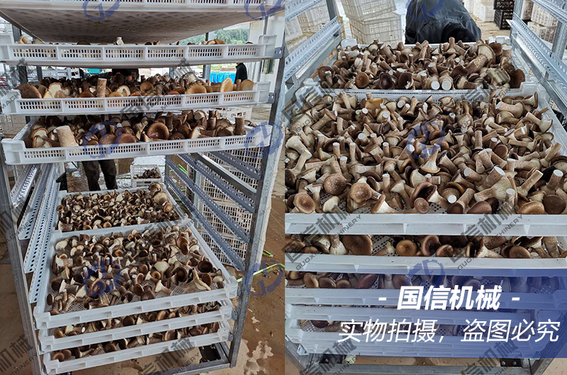 香菇烘干工藝對(duì)裝盤的要求嚴(yán)格。裝盤時(shí),需將菌蓋朝上,菌柄朝下,均勻擺放,不能重疊或者堆積,防止對(duì)香菇造成損壞,從而影響質(zhì)量。建議采摘后的6個(gè)小時(shí)內(nèi)必須送入烘干房,如有剩余,則需放入冷庫進(jìn)行冷藏。